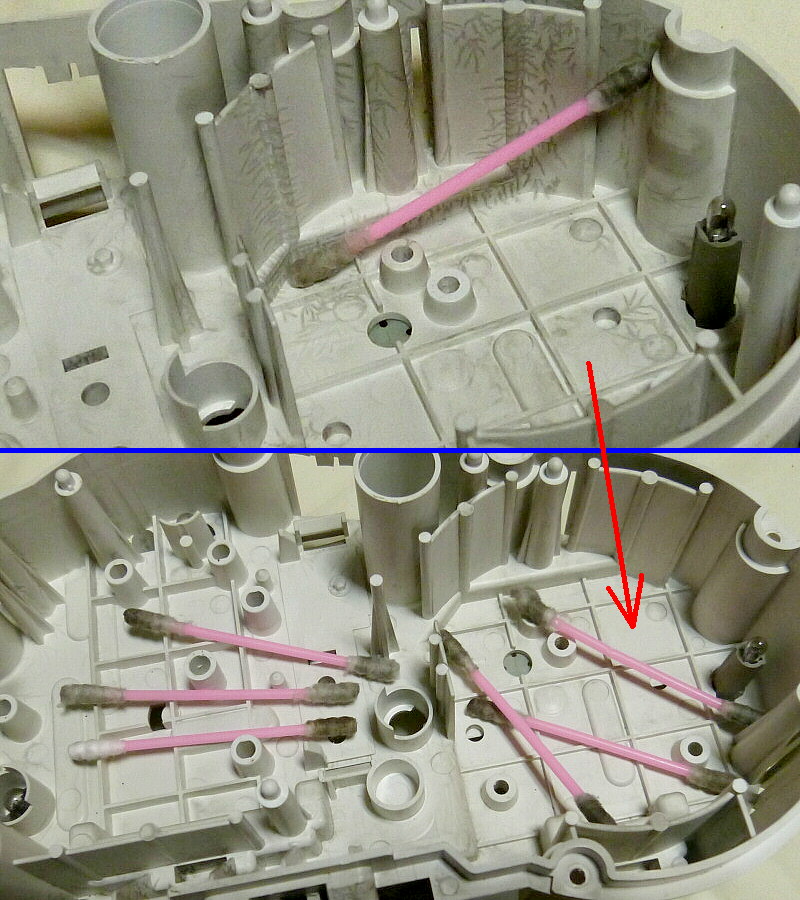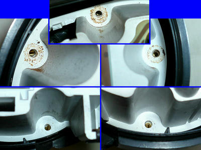 軸を受ける内部にも錆びの粉が付着しています。