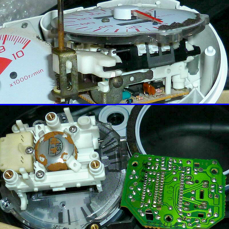 速度計の指針軸 及び 金属シェルには赤錆が発生していました。