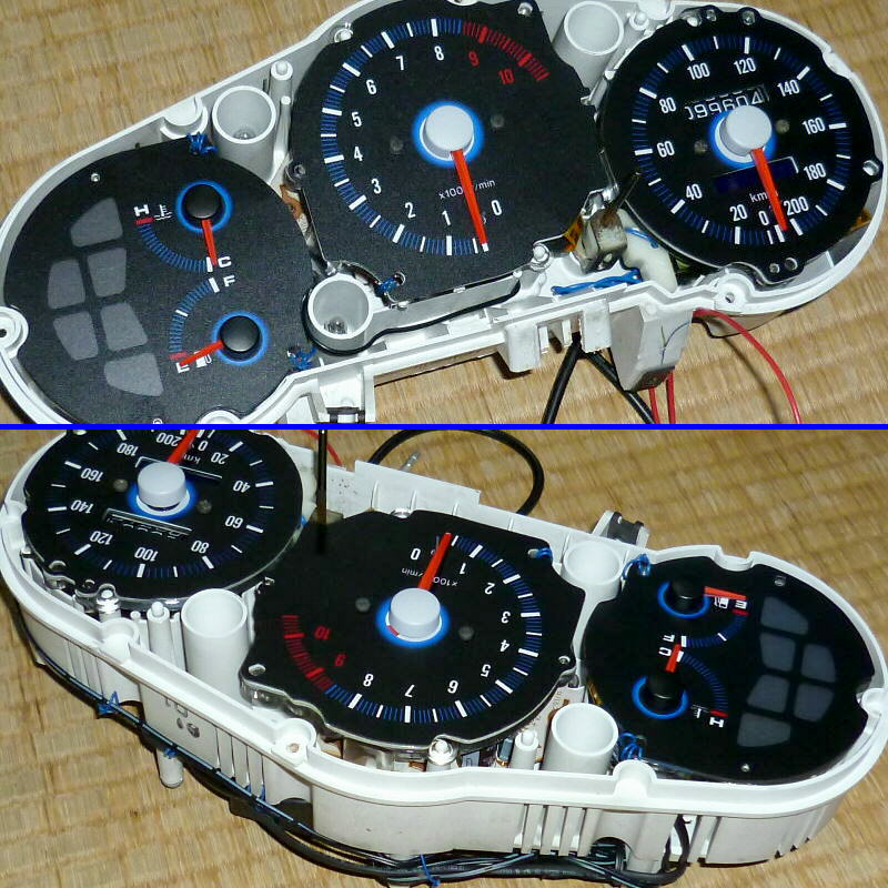 画像下側は、タコメーター背面 2ヶ所 & 水温・残量計背面 1ヶ所をLED化しています。