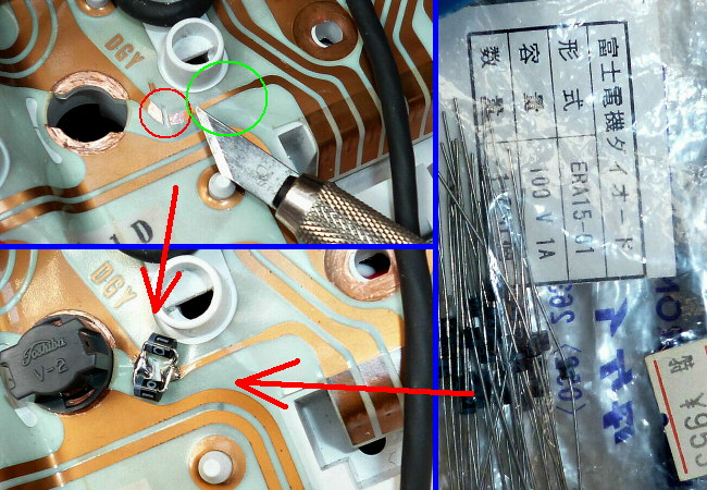 表面の絶縁皮膜を削り取ってダイオードを順方向でハンダ付け。