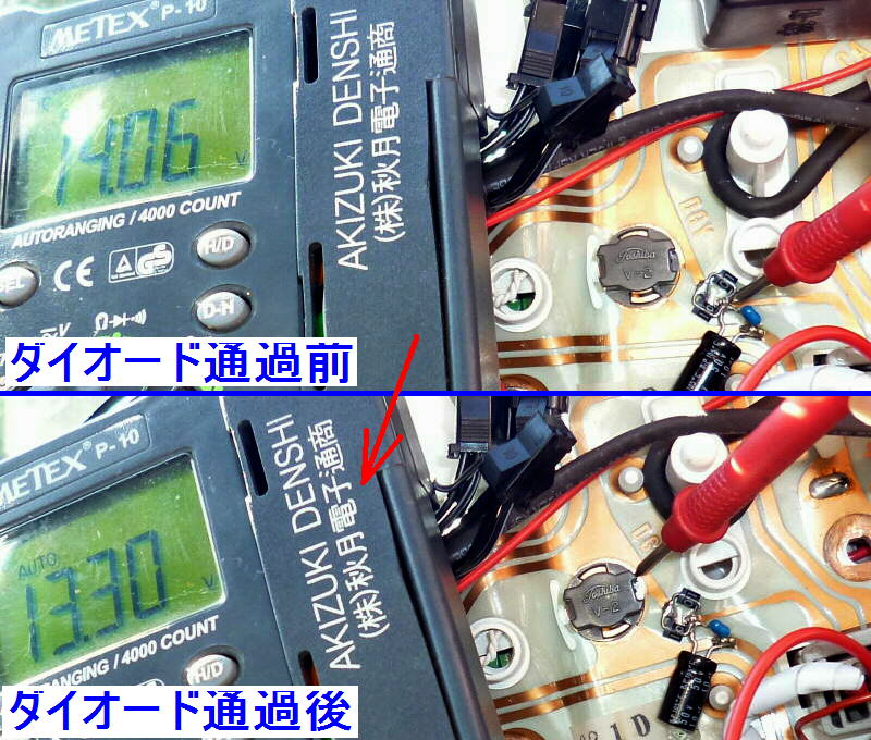 更にダイオードを使用して電圧を若干落とします。