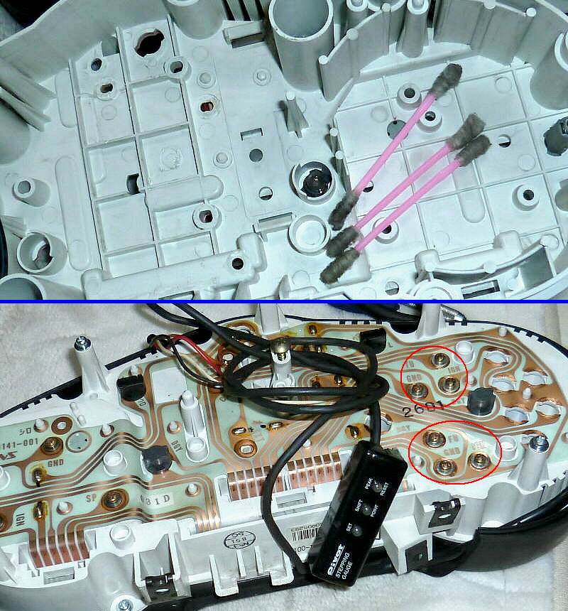 緑丸部分、純正タコメーター用のバックライト電球ソケットがありません。