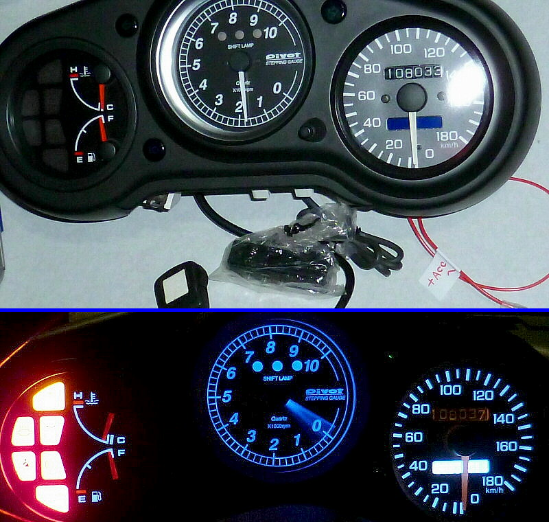メーターパネルがEL化され、pivot製のタコメーターが収まっています。