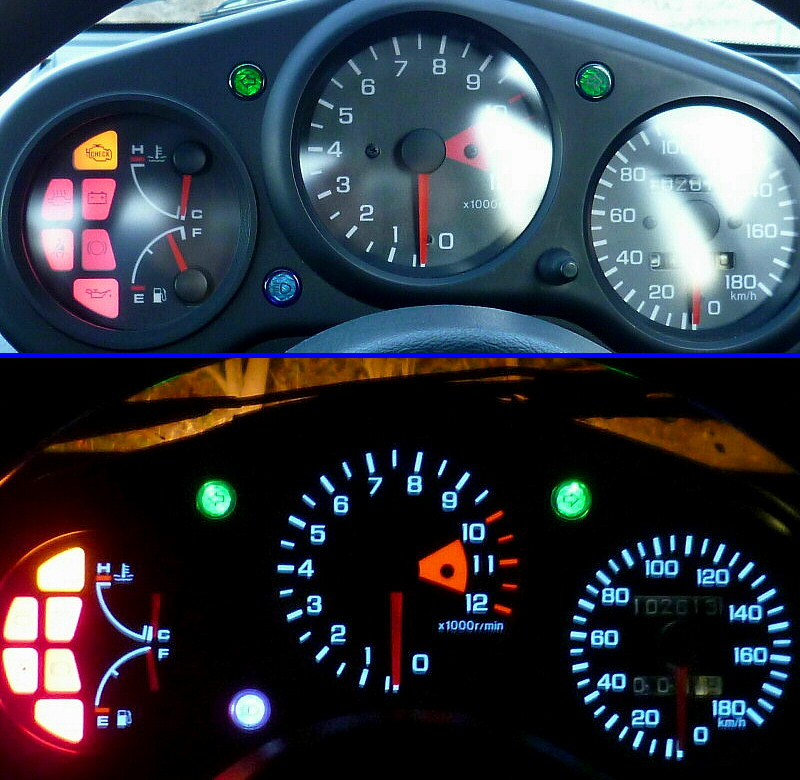 画像左側は、純正のオド&トリップメーターを直接照らすために