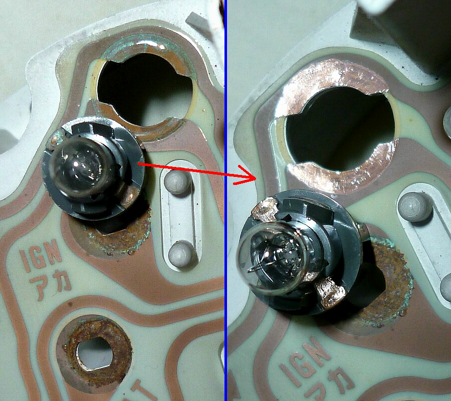 ⇒ メーター背面、電球ソケット~プリント配線シート間の接触不良が原因でした。