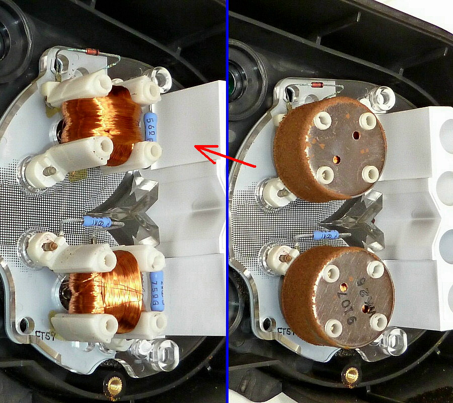 手前側の端子(金属棒) 4本が、指針駆動用モーターの信号線。