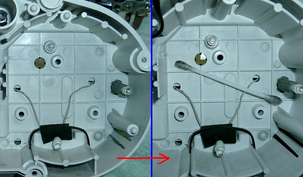 トリップメーターのリセット機構部、白い樹脂部品が修正してあるようです。