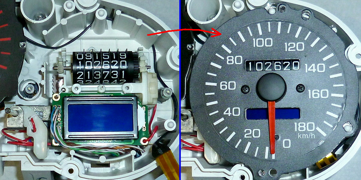 加工した速度計に、LCD・制御基板・リセットスイッチを組み込みました。