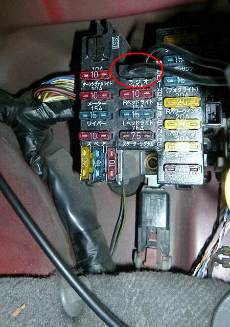なお、ヒューズBOXから電源をとる場合は、赤丸部分の 「ラジオ」 用ヒューズへ接続してください。